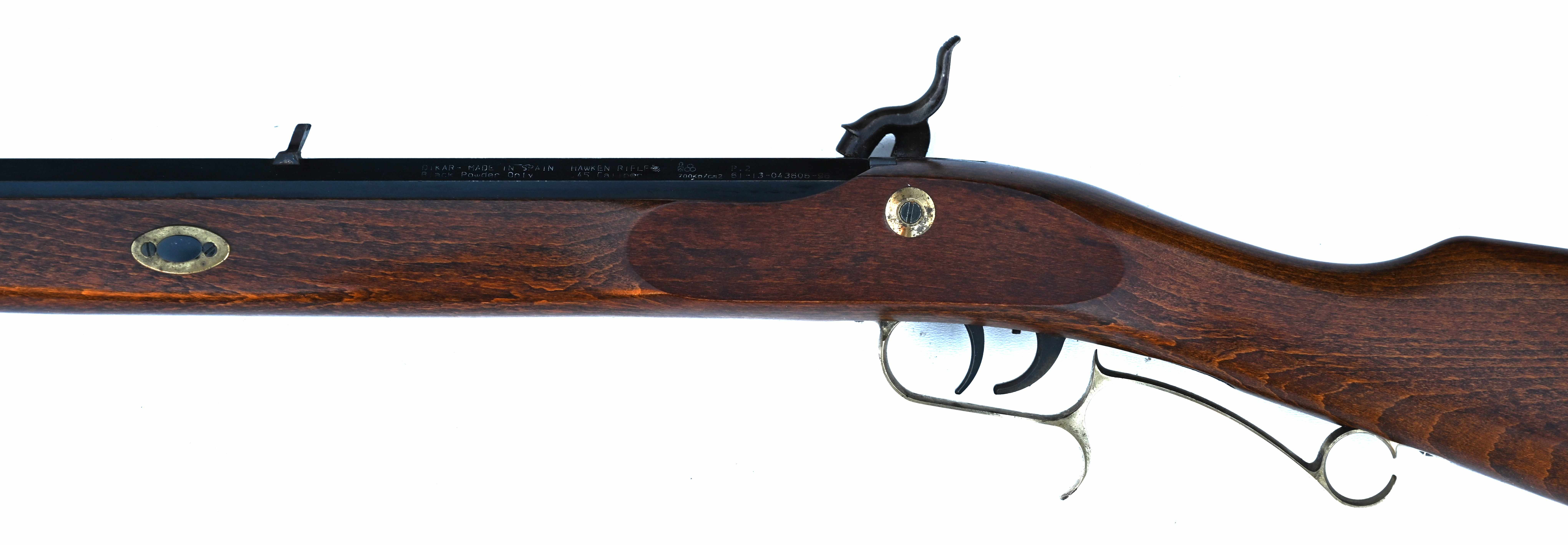 Seriennummer, gültige codiert-datierte spanische Beschusszeichen "P.2" = 1997, Kaliberangabe, „.45 Caliber Black Powder Only“ und „9,1“ mm, Herstellerangabe "DIKAR, MADE IN SPAIN" und Modellbezeichnung „HAWKEN RIFLE", Importeurzeichen “FWW“ = FRANKONIA Würzburg, „700 kp /cm2“.