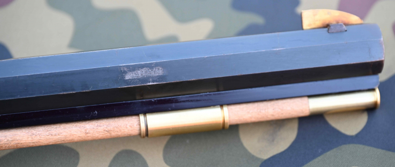 Rundum gut bis sehr gut erhaltener Gesamtzustand. Achtkantlauf innen mit tiefen, scharfen Zügen, blitzblank, alles tiptop. Optisch und auch technisch sehr schöner Gesamteindruck, schöner mackenfreier, neuwertiger Schaft mit Messingbeschlägen, Brünierung rundum ca. 99 % tiefmattschwarz erhalten, rostfrei, nur partiell minimaler Abrieb hier und da an den Laufkanten, und eine kleine flugrostige Stelle auf der rechten Laufseite, siehe Bild 6. Schöne Bunthärtung auf der rechtsseitigen Schlossplatte und auf dem Hahn! Alle 3 Rasten des Hahns tadellos stramm. Minimale Schmauchspuren am Pistonsockel uind links davon an der Laufwurzwel, aber der Piston selber ist piccobello sauber, wie neu. Nichts ist verbruzzelt!