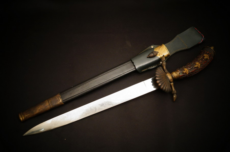 Zustand siehe Bilder. Original WK2. Bilder sind Gegenstand der Beschreibung. Sehr schöner Hirschfänger, geschmiedet. Lederscheide und Beschlagteile aus Bronze. Echter Hirschhorn Griff. Koppelschuh noch mit dran.