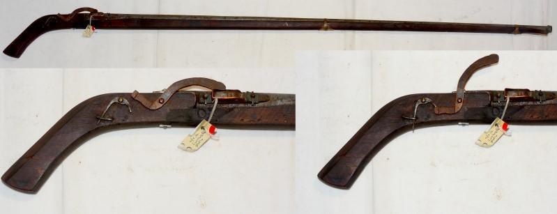 afrikanisches Luntenschlossgewehr, das Schloss ist ohne Feder und funktioniert durch die Schwerkraft des Hahns, Lauflänge 1,23 Meter, Gesamtlänge 1,46 Meter, das Kaliber beträgt 13 mm,