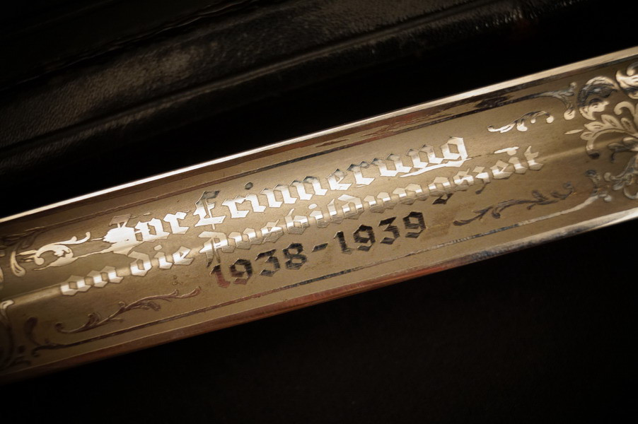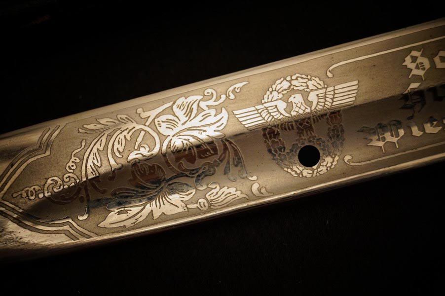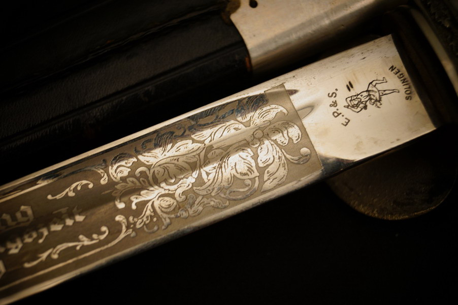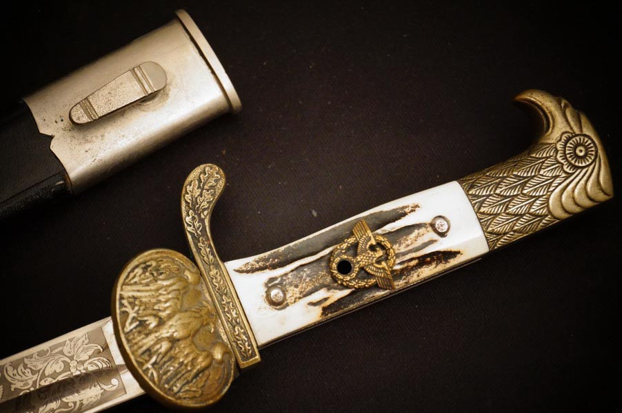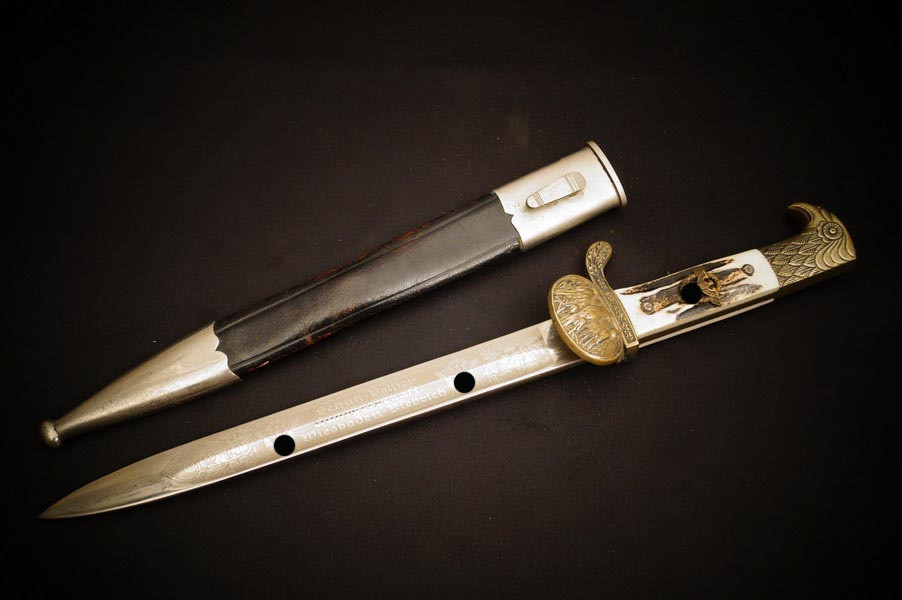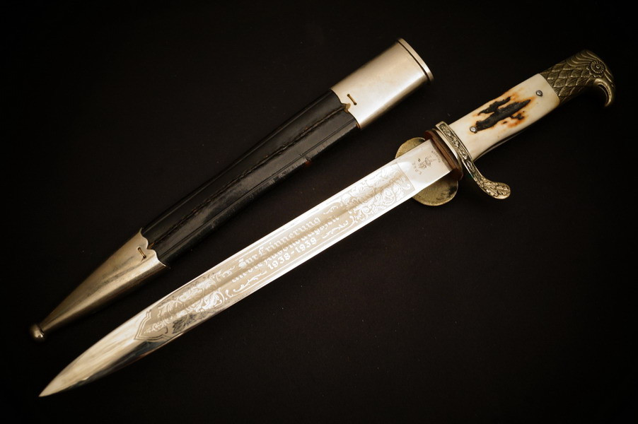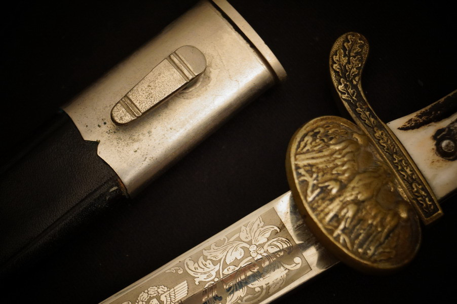 Zustand siehe Bilder. Original WK2. Bilder sind Gegenstand der Beschreibung. Lederscheide und mit sehr feiner Ätzung beidseitig. Ätzung bzw. Klinge ist vernickelt. Echthorn Griffschalen. Getragen und in sehr gutem Zustand ohne Schäden.