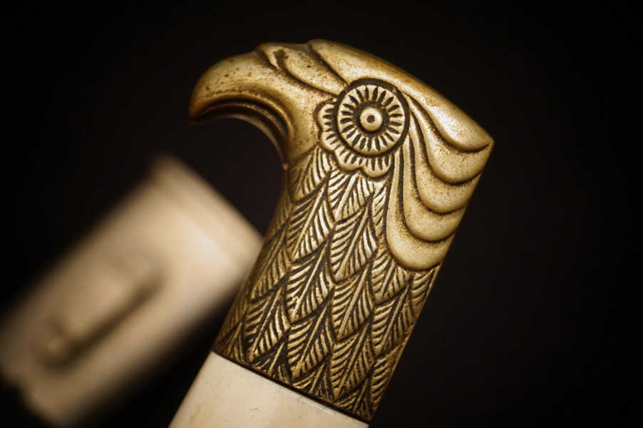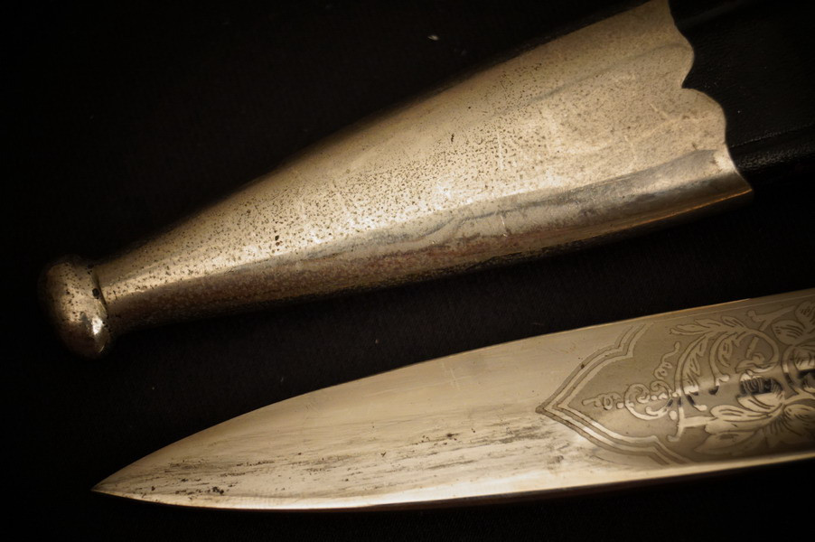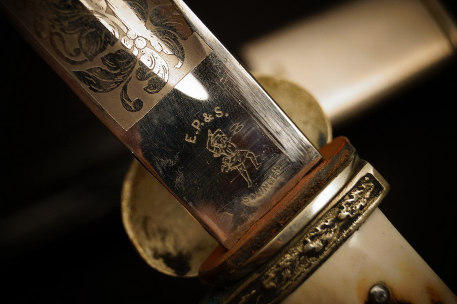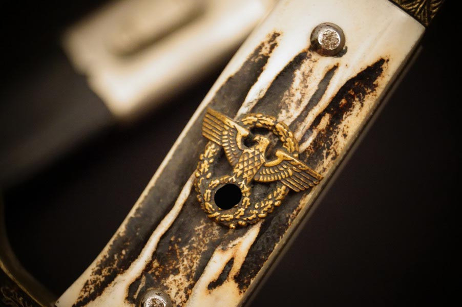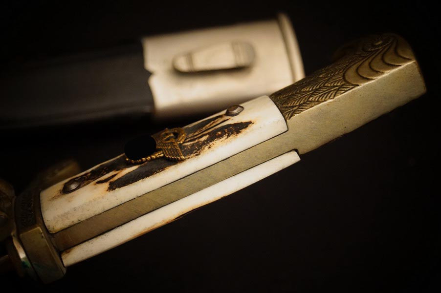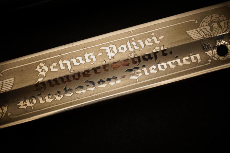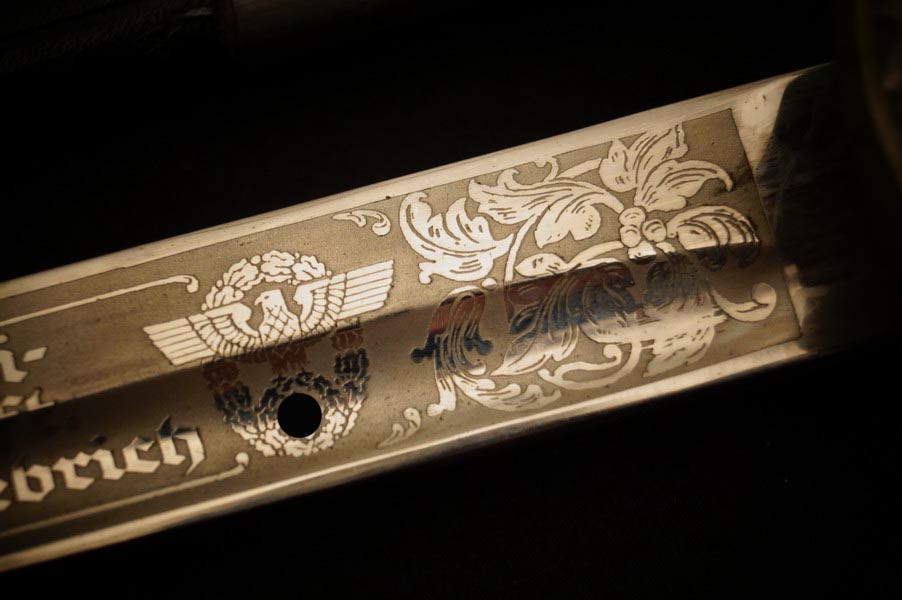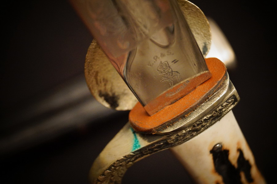 Zustand siehe Bilder. Original WK2. Bilder sind Gegenstand der Beschreibung. Lederscheide und mit sehr feiner Ätzung beidseitig. Ätzung bzw. Klinge ist vernickelt. Echthorn Griffschalen. Getragen und in sehr gutem Zustand ohne Schäden.