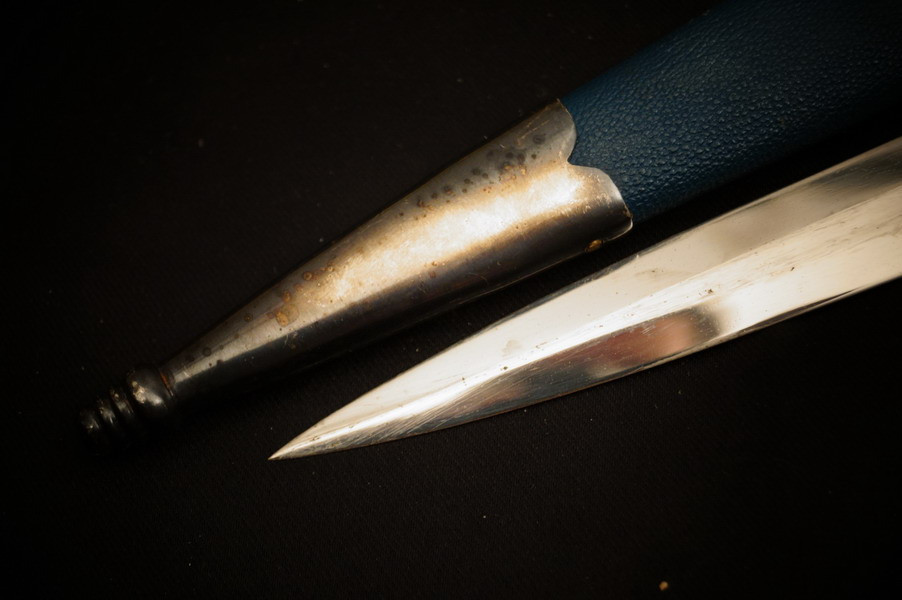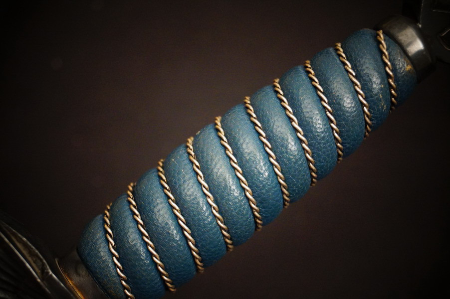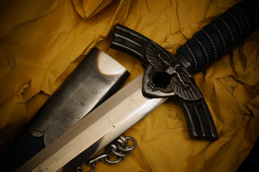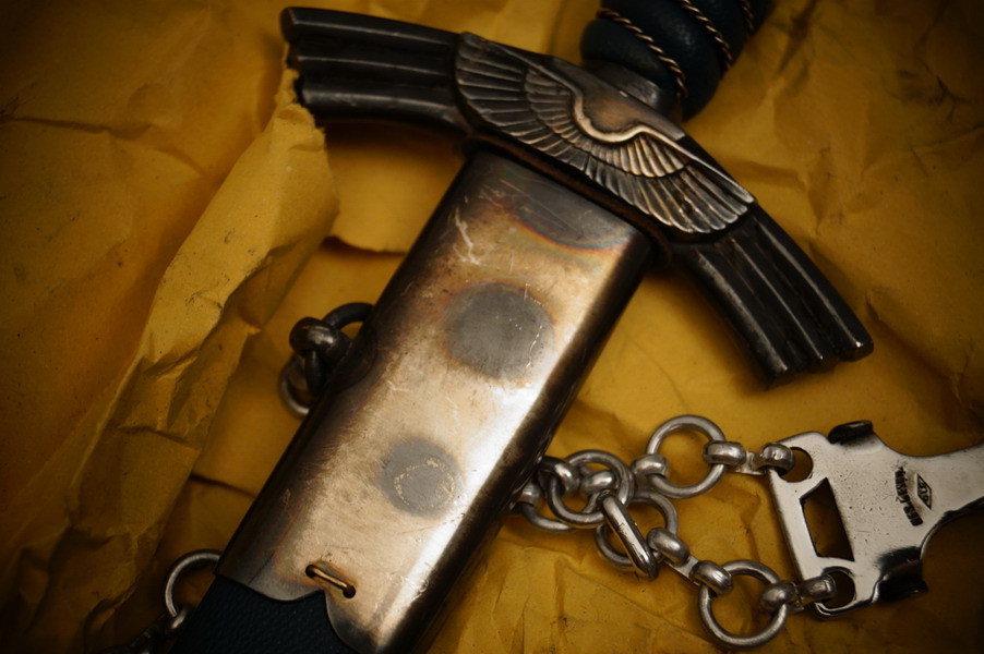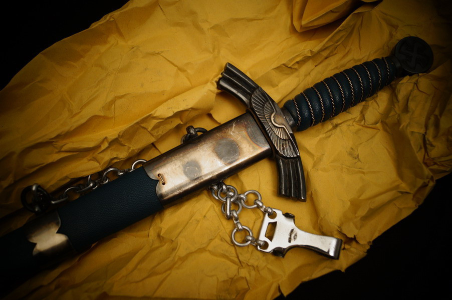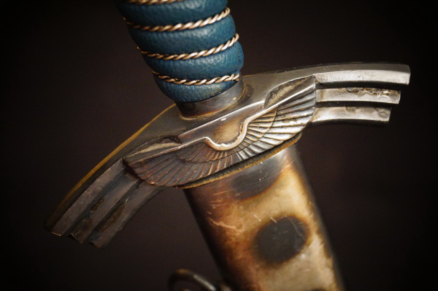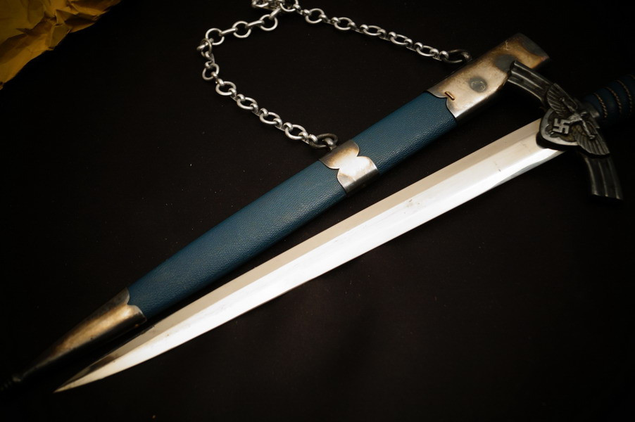 Zustand siehe Bilder. Original WK2. Bilder sind Gegenstand der Beschreibung. Stück ist nahezu ungetragen ! War jahrelang weggepackt - alle Teile am Dolch und der Scheide aus versilbertem Buntmetal. Die Versilberung ist komplett - oder fast komplett angelaufen in den Jahren. Das Stück ist ungeputzt !!! an einigen Stellen kommt die makellose Versilberung durch. Keine Kratzer im Leder oder in den Beschlagteilen. Ikarus des NXFK auch ohne Schäden. Der Dolch wurde scheinbar direkt aus dem Verkehr gezogen in dem Zustand und durch das neue NXFK/DLV Fliegermesser ersetzt. Griffstück aus Holz und wie die Scheide mit Saffianleder bezogen. Klinge aus Stahl, vernickelt - ohne Makel ! So wohl kaum noch zu findendes Stück !!!