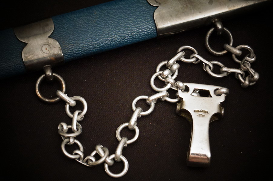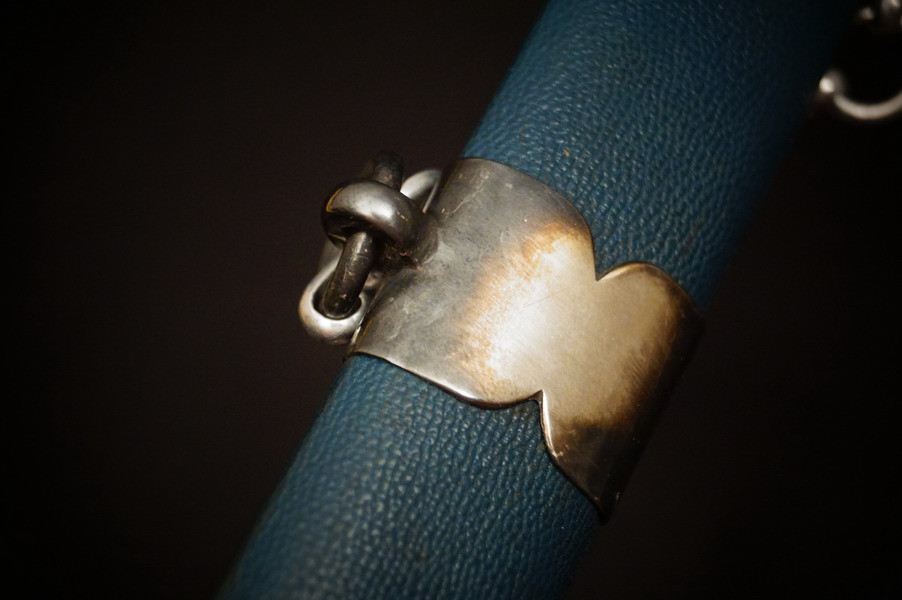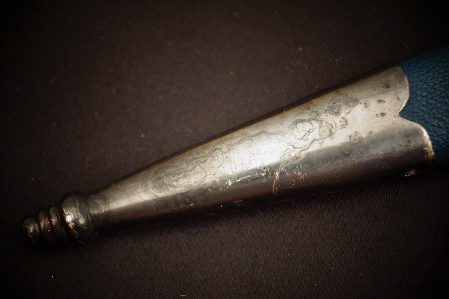 Der obere Beschlag ist versplintet und der Mittelbeschlag und der untere Beschlag hat Madenschrauben - versenkt. Foto fehlt leider. Die Scheide ist magnetisch ! Das Leder ist heller weil der Dolch nahezu ungetragen ist !