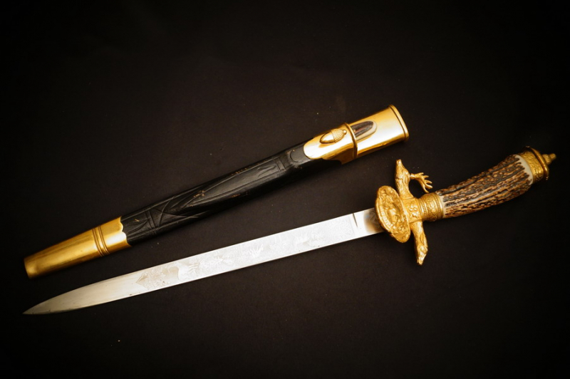 Zustand siehe Bilder. Original WK2. Bilder sind Gegenstand der Beschreibung. Lederscheide mit aufgesetzter zweiter Lederscheide für das kleine Messer. Stahlklingen, sehr feine Ätzungen. Alle Beschlagteile aus sehr gut vergoldeter Bronze. Echthorngriffe an den Blankwaffen. Sehr seltenes und sehr schönes Stück.