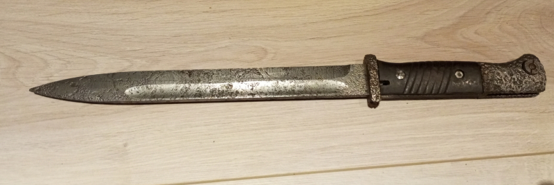 Verkaufe deutsches Bajonett zum K98 mit Bakelitgriffschalen, leider rostnarbig. Eine der Griffschalenschrauben nicht original. Der Drücker mit Feder haben volle Funktion und es kann problemlos aufgepfanzt werden. Details siehe Fotos. Ohne Scheide.