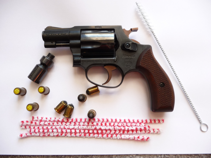 Angeboten wird ein Revolver vom deutschen Sportwaffenhersteller Weihrauch. Eine Arminius HW 37. Bei dieser Waffe sind genau wie bei der Erma EGR 66 und der Röhm RG 69 alle wichtigen Teile aus Stahl. Auch die Trommel und der ganze Hammer, was heute eher selten ist. Angeboten wird alles was zu sehen ist. Außer bei den Kartuschen. Es sind 18 Knall ( Schwarzpulver ) und 3 Gas. Der Revolver wurde benutzt