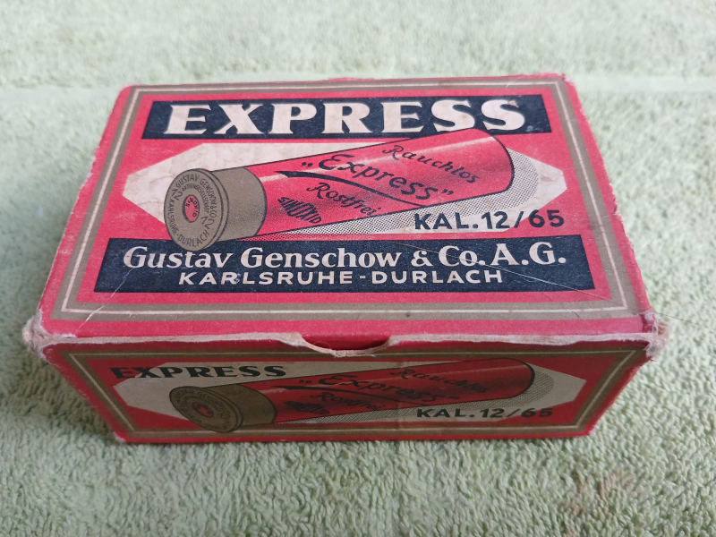 Aus Nachlass eines verstorbenen Jägers: Historische LEERE Schrotpatronenschachtel der Marke Gustav Genschow Express im Kaliber 12/65.