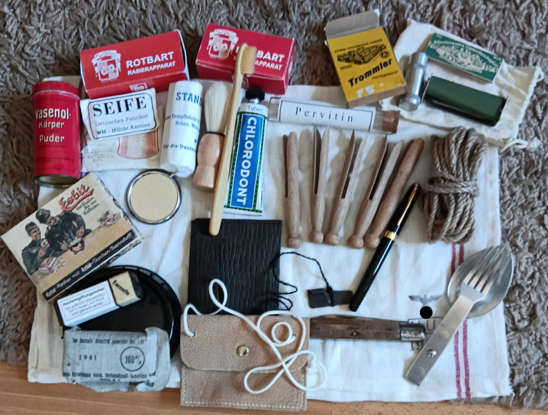 verkaufe Hier die Reste meiner Reenactmentaustattung WEHRMACHT. Es handelt sich um Ausrüstungsgegenstände die eher in den Bereich persönliche Austattung fallen und von den Soldaten entweder im Brotbeutel, den Brusttaschen der Feldbluse oder dem Tornister oder Rucksack getragen wurden. Bei einigen wenigen Sachen handelt es sich um Originale, dass meiste ist aber REPRO. Da ich auf Grund von Zeit usw. das Hobby Reenactment 1. und 2.Wk aufgegeben habe, verkaufe ich es jetzt hier. Für jemanden der selber Reenactment betreibt ist es sicherlich zu gebrauchen als Ergänzung seiner Austattung. AUFLISTUNG DER GEGENSTÄNDE: 1xHandtuch WH - Repro, 1xGöffel WH - Repro, 1xRauch-Utensilien mit Beutel, Drehmaschine - Original mit Sturmfeuerzeug WH - Original und Drehpapier - Original, 5xWäscheklammern - Original mit Leine, 1xStaubschutzbrille - Original, 1xLederumhängebeutel WH für die Erkennungsmarke - Repro, 1xButterdose - Repro, 1xPervitinbehälter - Repro, 1xTaschenmesser WH - Original, 1xDosenöffner - Original, 1xEsbitkocher mit Packung - Repro, 1xLosantinbehälter - Repro, 1xVerbandspäckchen - Original, 1xSatz Hygieneartikel für Rassur und Waschen - Repro