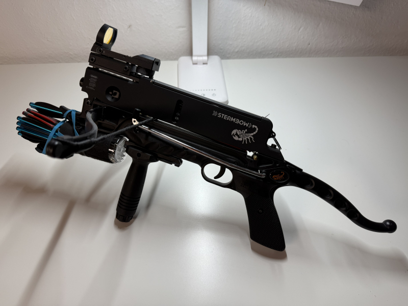 Die Armbrust habe ich vor einigen Jahren neu gekauft, diese ist unbeschossen und war im Schrank gelagert (Kein UV Licht). Auf der Armbrust ist ein hochwertiges Metall Red Dot funktionierend mit Knopfzelle verbaut, des Weiteren 3 Stück 22 mm Montageschienen. sowie ein M4 Type Frontgriff, sowie ein Befestigungspunkt für einen 1-Point Sling. Integrierter LP (deaktiviert) Einen 1-Point Sling (nicht auf den Fotos) lege ich bei.
