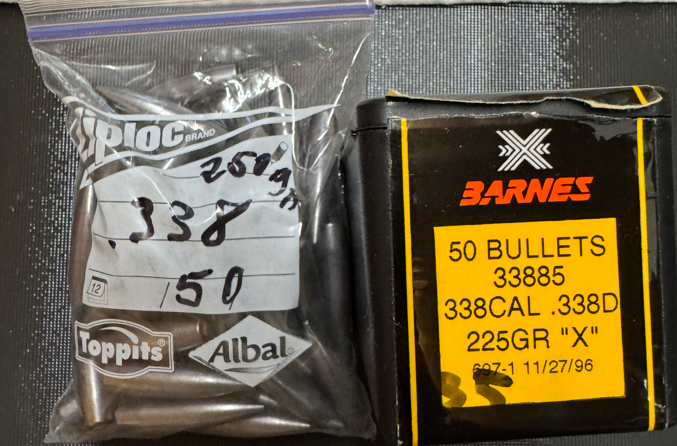 zum Verkauf stehen aus Wiederlader-Nachlass 85 Geschosse .338 unterschiedliche Gewichte. 35 x Barnes 225 grain 50 x vermutlich Prvi Partizan 250 grain