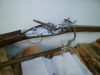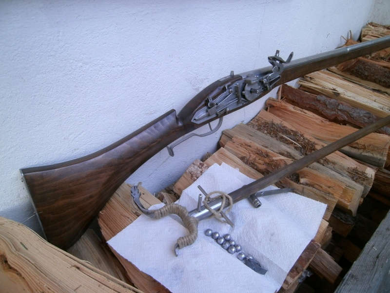 Biete euch einen nachbau einer Rad-Luntenschlossmuskete an.Länge 158,cm kal 14mm Schaft aus Buche in nuss gebeizt.Schloss mit Radabdeckung Sicherung automatischer Pfannendeckel Radzündung und Luntenzündung .Gabel mit zusätzlicher Luntenhalterung wenn alles ausfält kann man auch mit der Lunte zünden!!!!Oder den Nachbarn sei Geschütz zünden!!!Mit dazu sind ein paar Kugeln Schlüssel Blei für den Pyrit zum einschlagen und die Beschussbescheinigung.Das ist der Letzte Lange Lulatsch der von meiner seite kommt,Gruß mimono