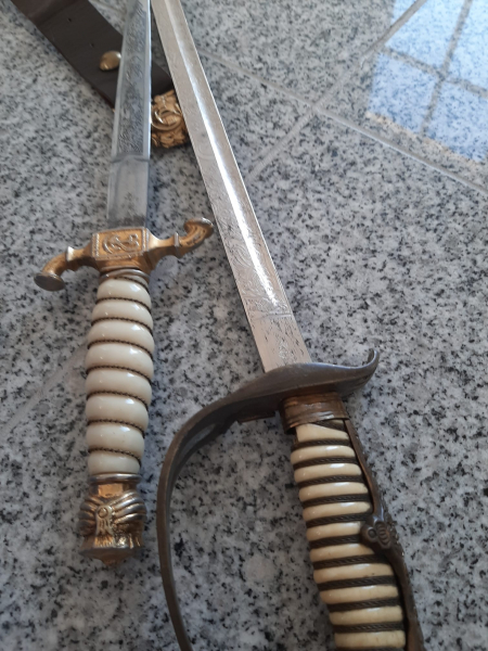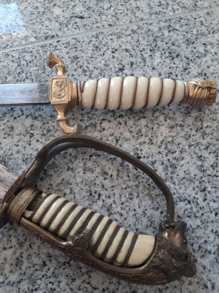 bei dem Dolch hat gibt es am Griff eine Absplitterung, sonst ist er in einem gutem Zustand.