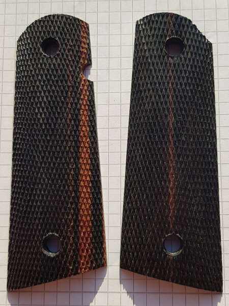 Sie bieten hier auf ein paar ( li.+re. ) Griffschalen für Colt 1911-er und baugleiche pistolen. Neu und unbenutzt. Hartholz und Checkering. Es handelt sich um exakt die Griffschalen die auf dem Bild zu sehen sind. Photo am tageslicht gemacht daswegen schatten zu sehen. Quadratische Hintergrund = 5 mm Raster. Weitere Fragen, Bilder etc. gerne jederzeit per Anfrage hier. Versand per DHL mit Send.Nr. oder auch nach Wunsch. Mfg.