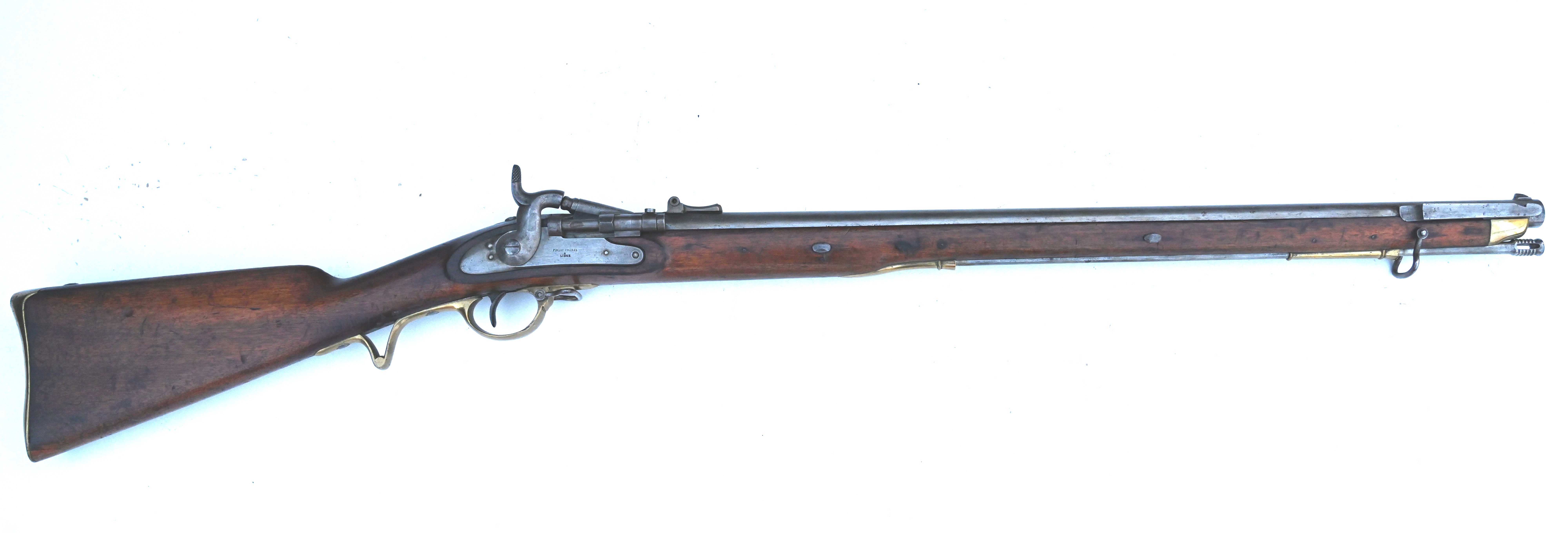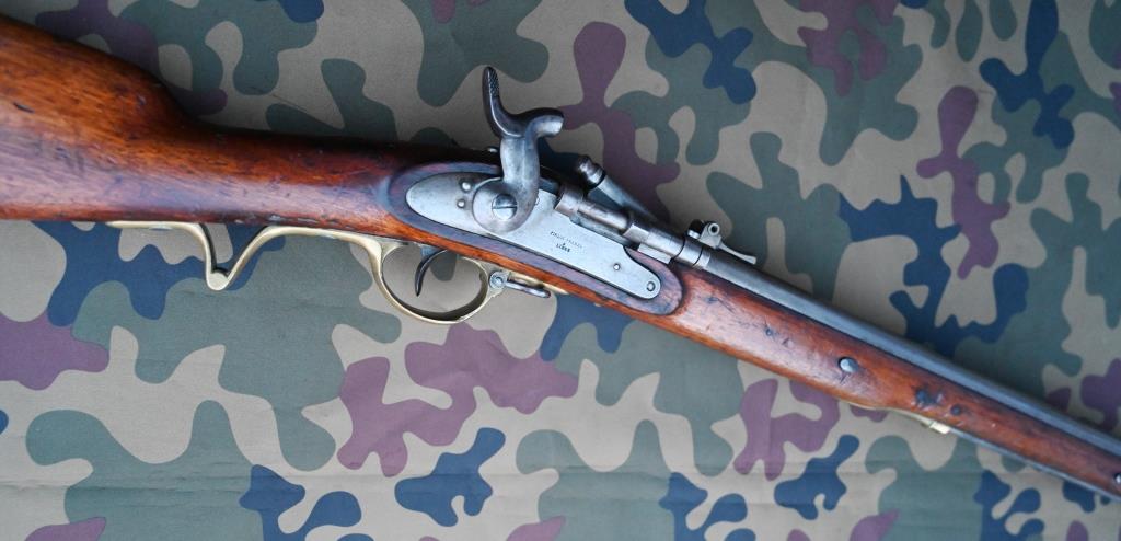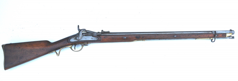 These rare rifles were originally part of an order of some five thousand Belgian-made Thovenin (pillar breech) percussion rifles by Pirlot Frères, based upon the British Brunswick Rifle, acquired by the rebellious forces in the German states of Schleswig-Holstein, where the guns were designated as the Model 1849. After the rebellion was suppressed, a total of 2,450 of these captured rifles entered Danish service where they were initially modified at the Krongborg Arsenal to accept a Danish saber bayonet. The alterations occurred circa 1853-1855 and the rifles were designated as the Model 1853 and issued to the Danish Navy. After the adoption of the Rolling Block Rifle for infantry service, the lack of funds to obtain those guns for the Navy led to the alteration of many of the M1853 Rifles to cartridge breechloaders via the Snider system, similar to the British Snider MkIII variant. The guns were chambered for the largest rimfire cartridge to see military service, the Danish 16.9mm RF, also known as the 17x28R or the 17.5x29R. The rifles remained in service until they were replaced by more modern purpose made breechloaders.