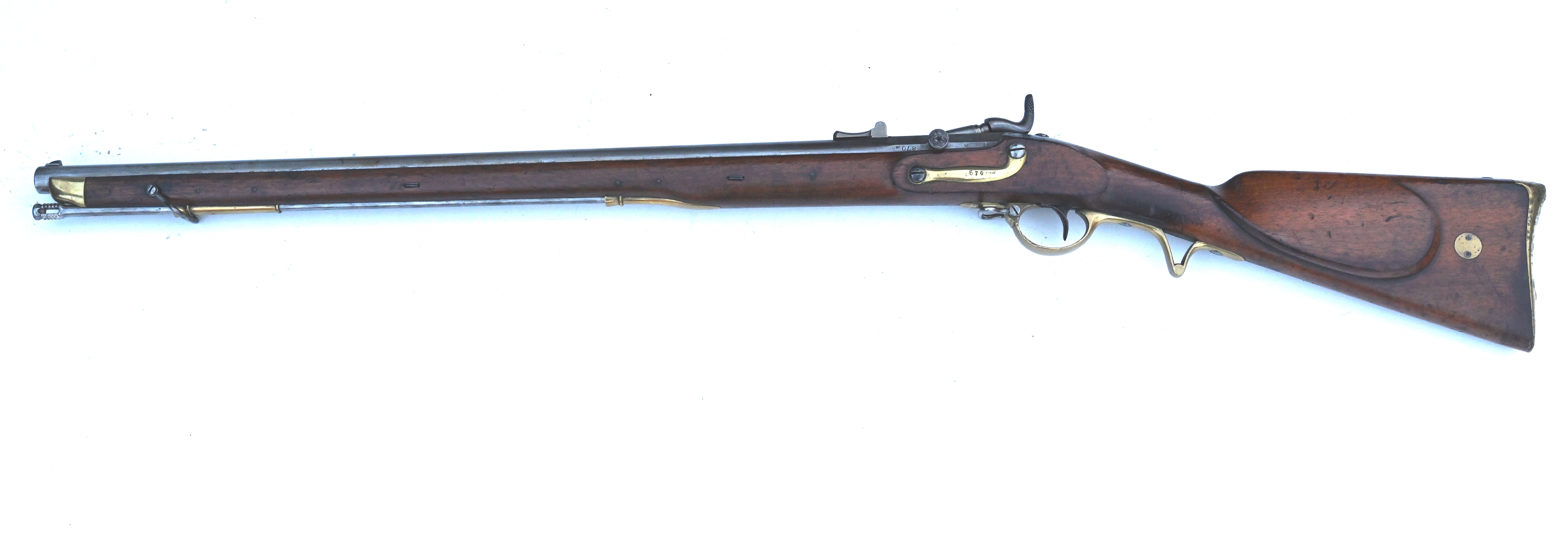 Die Schloßplatte rechts ist sehr gut lesbar mit der Herstellermarke "PIRLOT FRERES À LIÈGE" geprägt. Die Seriennummer "670" findet sich linksseitig auf der Laufwurzel, auf dem Messingbeschlag am Schloss, auf der Unterseite des Schwenkriegels bzw. Tabernakelverschlusses, auf der Messing-Schaftkappe, auf dem Messing-Abzugbügel und auf dem massiven Lade- bzw. Putzstock. Auf letzterem ebenfalls ein kleiner durchgestrichener Regimentsstempel. Große Krone auf der Verschlussoberseite, oberhalb der Gasentlastungsöffnung.