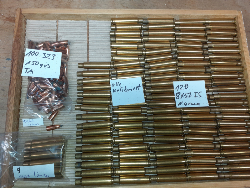 Hier geht es um 120 8x57IS Hülsen Kalibriert von Norma und 100 150 grs TM Geschosse aus einem Nachlass für die ich keine Gewährleistung übernehme. Die Hülsen sind bestimmt kalibriert und mit LR ZH versorgt. (sicherheitshalber würde ich ein oder 2 Hülsen vor dem Laden ausprobieren ob die ins Patronenlager passen. Notfalls ohne Ausstoßer kalibrieren.)