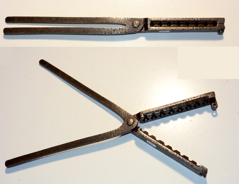 Kugelzange in der Größe einer kleinen Schmiedezange, mit ihr können gleichzeitig 8 Rundkugeln im Kaliber 12,5 mm gegossen werden, Länge 38,5 cm, 18./19. Jahrhundert, die Oberfläche ist etwas rostnarbig, die Kugelformen selbst noch gut