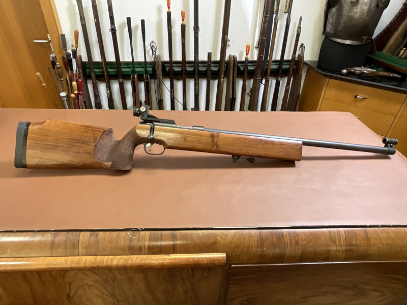Zum Verkauf steht eine gebrauchte Einzellader‑Matchbüchse der Firma Carl Walther Ulm im Kaliber .22 LR.