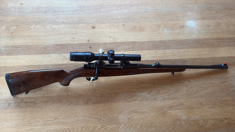 Repetierbüchse Frankonia Mod.98 Classic kurz Kal.8 x 57 IS Zustand:gebraucht Bestzustand LL:50 cm ,offene Farbige Visierung, Montage EAW-Schwenk 30 mm Ringe Zielfernrohr Meostar R1 1-4x22 Abs.K-Dot beleuchtet,180 Grad Sicherung,trocken stehender Druckpunktabzug,Piistolengriffkäppchen mit Gravur liegender Rehbock.EU-Versand durch einen in Deutschland ansäßigen Exporteur Ihrer Wahl.