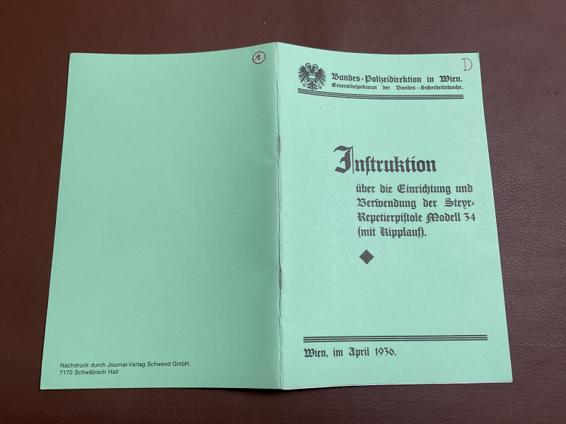 Handbuch für die Einrichtung / Verwendung der Steyr-Repetierpistole Modell 34 vom April 1936, Wien