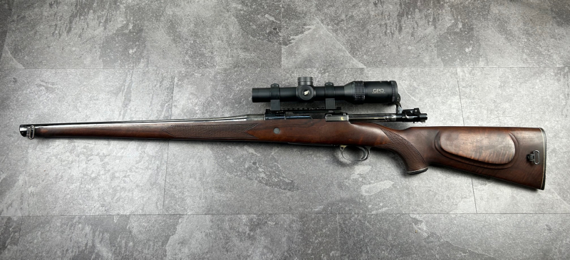 Repetierer Mauser Mod.98, Kaliber 7x64, Stutzen, für Drückjagd oder Durchgehschützen hergerichtet mit Riemenbügel auf der Seite, Kurzer Lauf, Timney Abzug, Drückjagdglas von GPO mit Abs.4 und Leuchtpunkt,, 1-6x24 Mod. Spectra 6x (Neupreis 699,-), Weaver Schiene mit stabilen Ringen, Riemenbügel an der Mündung damit nichts über den Kopf steht beim Treiben. Gummi Kugel (Überzug) am Kammerstengel für schnelles Repetieren.
