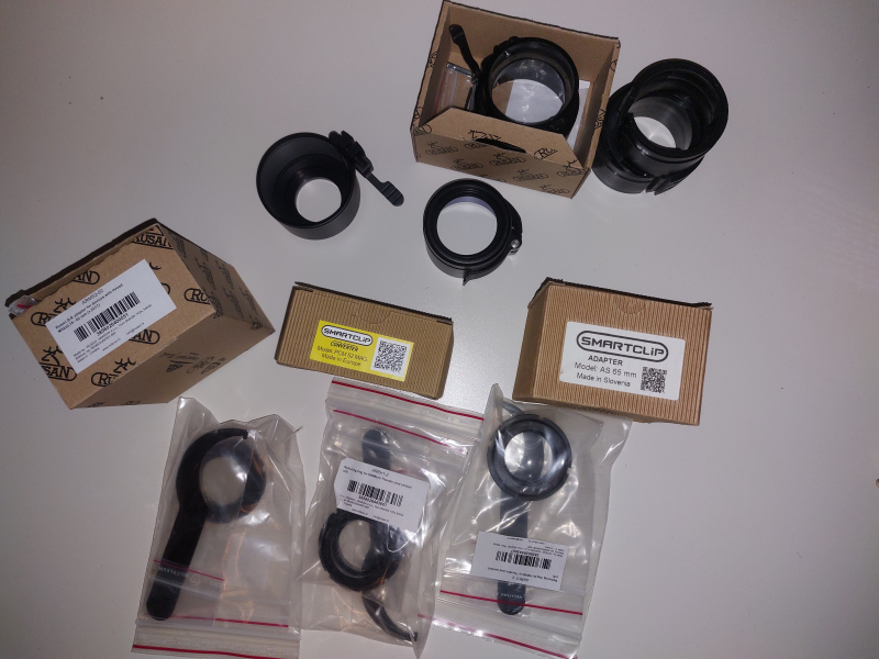 9 teiliges Konvolut Adapter und Zubehör von Rusan & Smartclip bestehend aus; Smartclip 56mm auf M52x1 Gewinde Zustand neuwertig, Smartclip 65 mm auf M52x1 neu, original verpackt, Smartclip Converter PCM 52 MAG neu original verpackt, Rusan 62 mm auf M52x1 original verpackt, Rusan 62mm auf 35 mm Außengewinde neuwertig, Rusan DFA75 DN55-62mm gebraucht, 3x ARRH1-2 Reduzierring Hikmicro Thunder