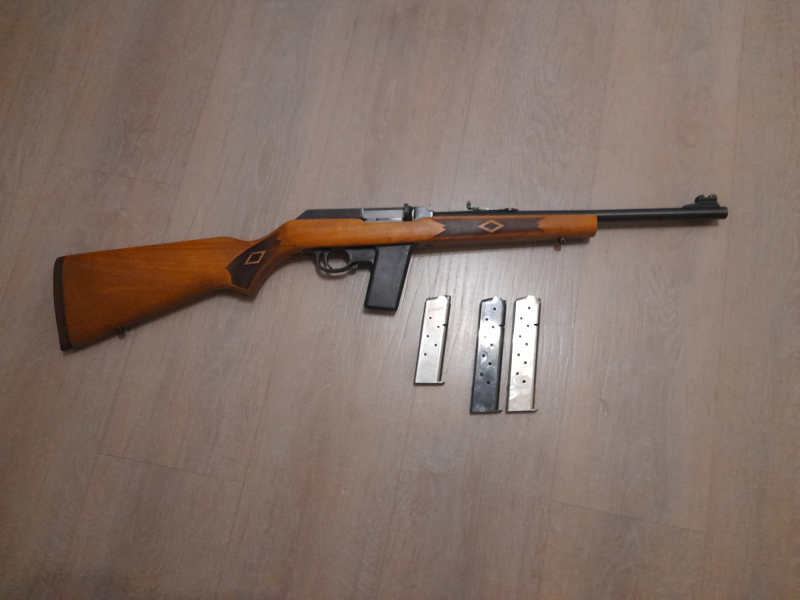 Hallo, ich verkaufe eine Marlin Camp Carbine Selbstladebüchse im Kaliber .45 ACP. Die Waffe ist sehr gepflegt und hat nur minimalste Gebrauchsspuren ( eigentlich neuwertig ). Zu der Waffe gehören ein originales 7 Schuss Magazin von Marlin, und 2 x neue 10 Schuss