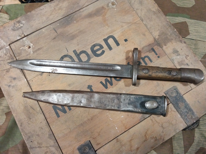 Bajonett 1oder 2 Weltkrieg mit Scheide im soweit gutem Restaurationsfähigen Zustand die Scheide ist verbeult die Spitze der Scheide fehlt. Altersnachweis erforderlich. Viel Spaß beim bieten.