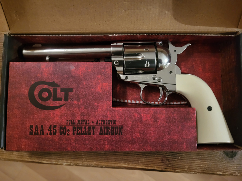 Colt Co2 Single Action Army Revolver in 4,5mm. Kaum geschossen, daher fast neuwertiger Zustand. Mit den 6 original Reduzierpatronen, Co2 Kartuschen, Bedienungsanleitung und original Verpackung, wie auf den Bildern zu sehen. Privatverkauf ohne Gewährleistung und Rücknahme.
