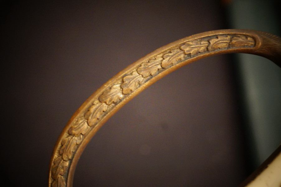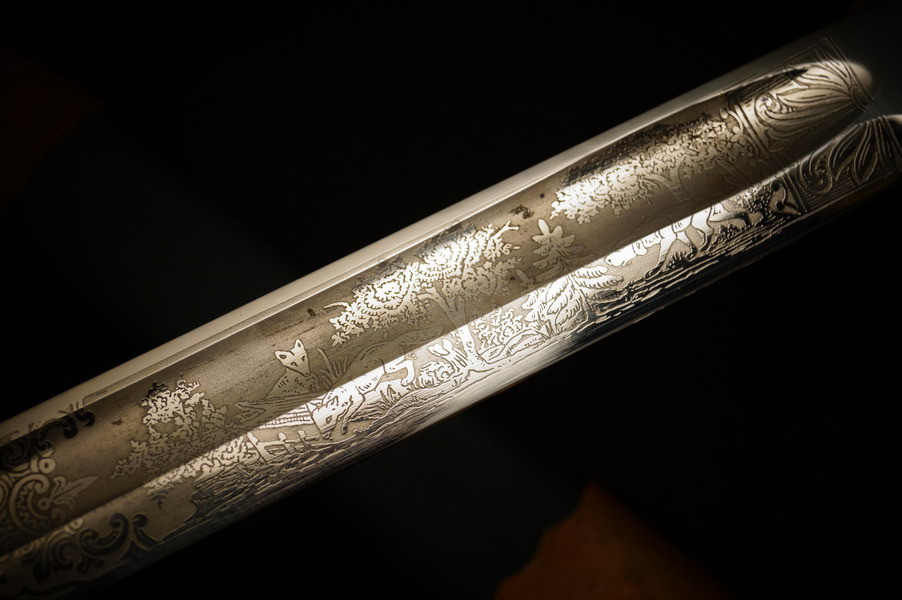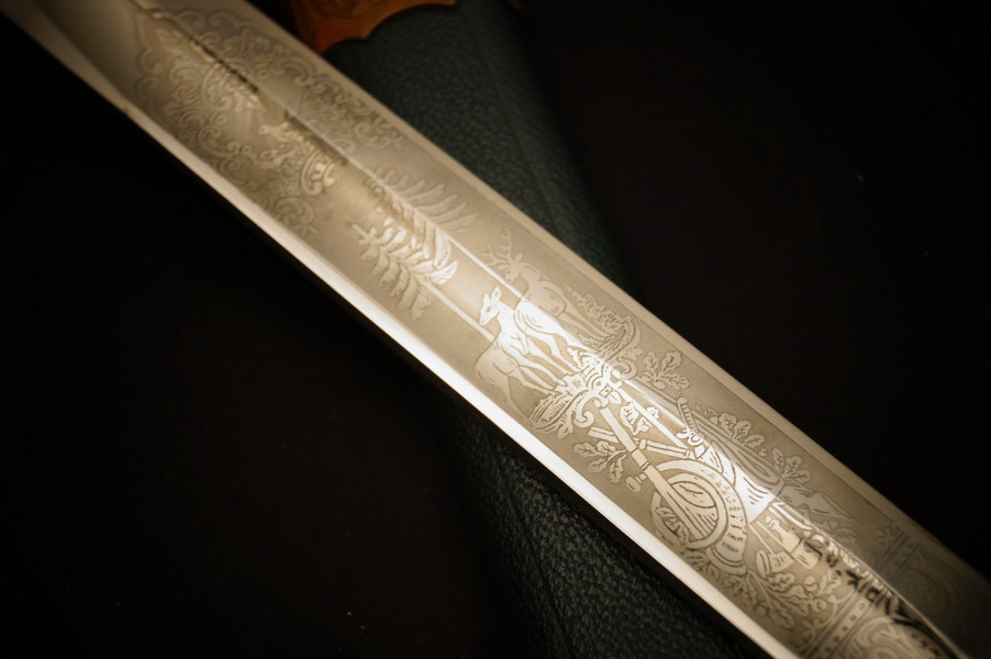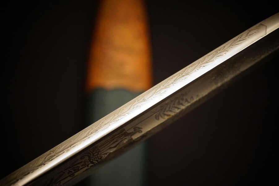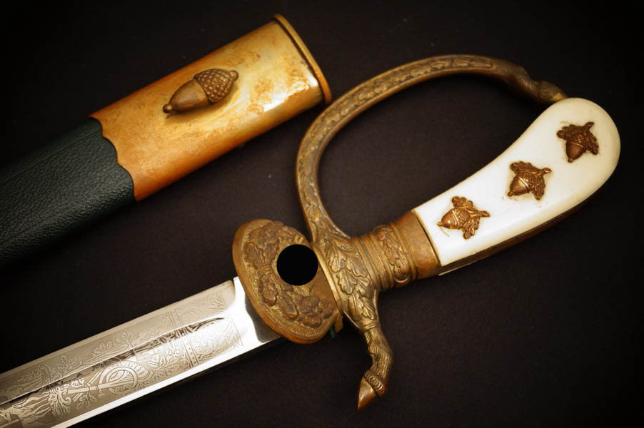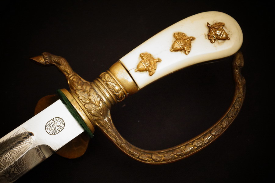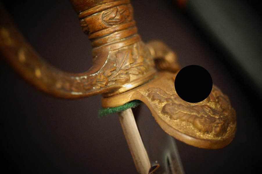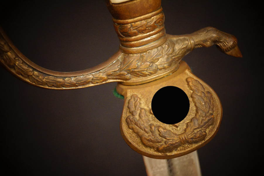 Zustand siehe Bilder. Original WK2. Bilder sind Gegenstand der Beschreibung. Bronzebeschlagteile und Bügel-Gefäß. Vergoldung teils noch erhalten. Klinge perfekt im Zustand und mit dreifacher Ätzung. Lederscheide. So wie alles andere auch direk von der Wand in die Auktion. Sehr alte Sammlung die hier verkauft wird !!!