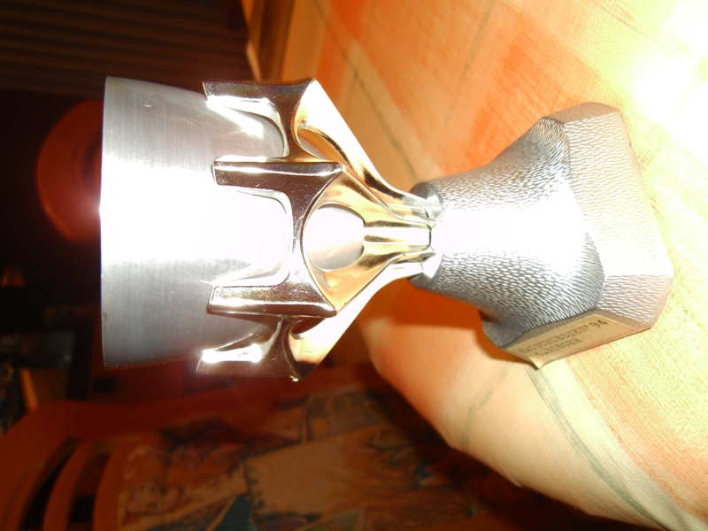 Kleiner neutraler silberfarbener Schießpokal in abstrakter Form, blanko, auf kleinem Sockel, ohne Beschriftung, Höhe 14 cm, Breite 8,5 cm.