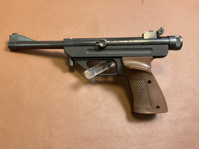 Zum Verkauf steht eine CO₂-Luftdruckpistole der Firma Hämmerli, Modell Single, im Kaliber 4,5 mm (.177). Die Waffe wurde vor 1968 gefertigt, hat eine Gesamtlänge von 30,5 cm und befindet sich in einem guten, altersbedingten Zustand. Bitte beachten Sie, dass für dieses Modell keine passenden CO₂-Kartuschen mehr im Handel erhältlich sind, sodass die Waffe ausschließlich als Sammlerstück angeboten wird.
