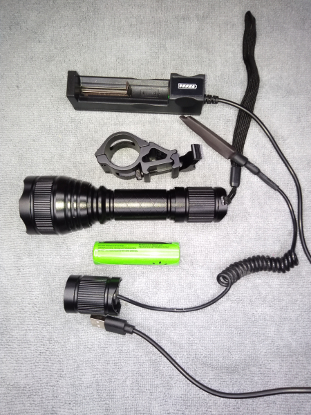 ein Druckschalter (an und aus) und zusätzlich ein Fernschalter (Dauerbetrieb und Tippbetrieb!), außerdem wird eine seitlich versetzte (Weaver, Picatinny) Schnellspannmontage ein Accu 18650 und ein USB Ladegerät für den Accu mitgeliefert, siehe Foto. Das Licht des Strahlers mit 940 NM ist für Menschen nicht sichtbar!