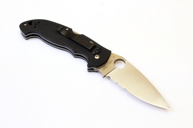 Ergonomisch strukturierter Griff. Blanke, satinierte Griffmontur. Das Messer mit Back-Lock Verschluss. Daumenmulde des Mechanismus auf dem Griffrücken. Die Griffschalen mit rutschfester Oberfläche. Der Griff mit einem Gürtelclip ausgestattet. Versehen mit dem Firmenlogo „Spyderco“.