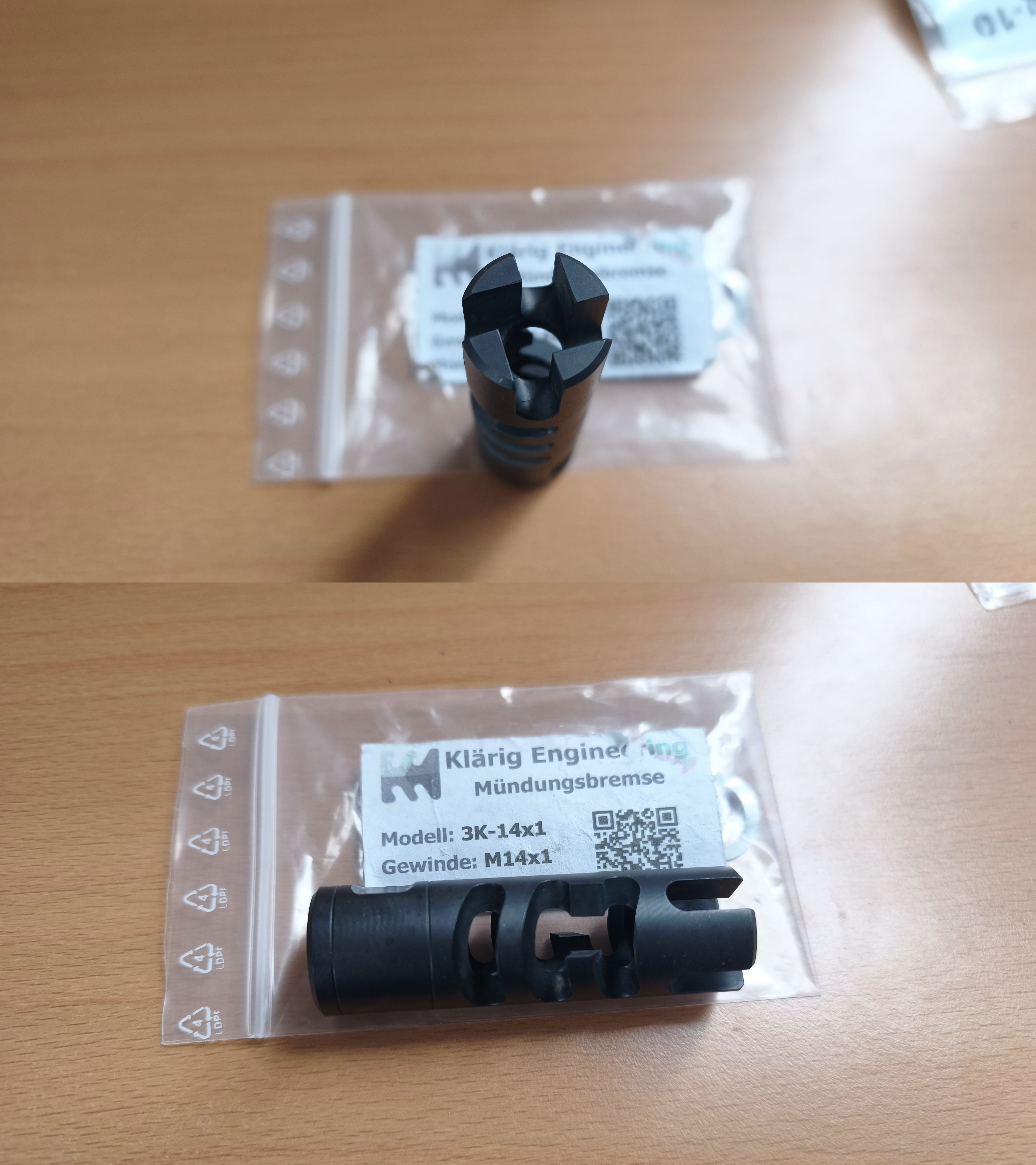 Neuwertige Mündungsbremse mit 3 Kammern. Klärig 3K mit M14x1 Gewinde. Nur für eine handvoll Schuss benutzt. Wegen Verkauf der Waffe jetzt über. Passscheiben zum Ausrichten liegen bei.