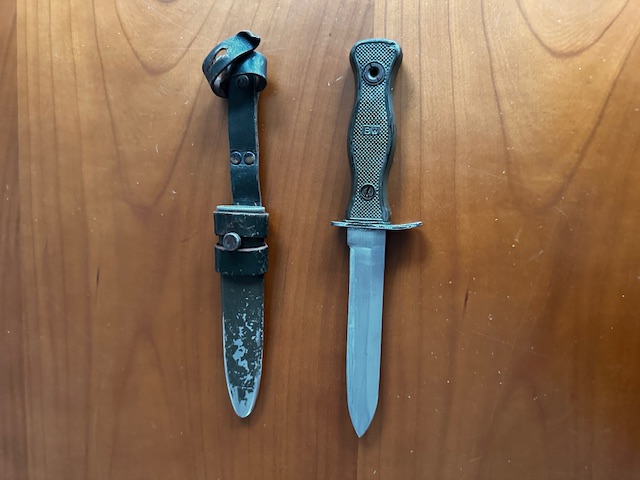 Bundeswehrkampfmesser aus dem Jahr 1970 mit Messerscheide. Die Klinge wurde