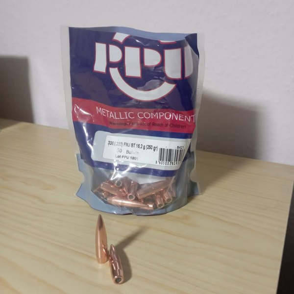 Verkaufe 188 Stück PPU Geschosse .338 FMJ BT 16,2gr. (250gn.). 138 Stück Lot 1801 (eine Verpackung geöffnet und 12 Stück verbraucht) und 50 Stück Lot 1802. Versende nur nach Deutschland, die Versandkosten werden genau berechnet (DHL ca. 7,00 Euro).