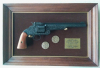 Wyatt Earp Revolver mit zwei Bordellmarken im Originalrahmen. Funktion bestens aber nicht schußfähig und frei ab 18.