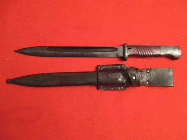 Seitengewehr / Bajonett für Karabiner 98k, unbenutzt. Koppelschuh hat etwas gelitten und kleine Delle in der Scheide vorm Koppelschuh rechts. Hersteller, aof 44, könnte auch anders lauten. Schwer lesbar. Seriennummer7904. Bakelit-Griffschalen, Reinigungsloch. Klinge ist frei von Kratzern, wahrscheinlich noch Wekrsfett / Öl. Scheide ist auch frei von Kratzern, bis auf die Delle Weitere Fotos auf Anfrage. Internationaler Versand auf Anfrage.