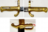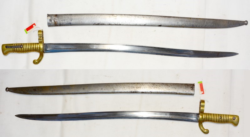 Französisches Bajonett für den doppelläufigen Marinekarabiner 1840, der massive Messinggriff wie beim Bajonett Mle 1842, die Yataganklinge etwas leichter und fast identisch dem 1866 Bajonett (verklemmt jedoch in einer 1866er Scheide also nicht völlig gleich), Mündungsring für Doppellaufwaffe, auf Mündungsring Hilfskorn, keinerlei Markierung, die Scheide ist metallisch blank und die Schlaufe (Drahtbügel) zur Befestigung im Koppelschuh ist nur noch in Resten vorhanden, Klingenlänge 57,5 cm