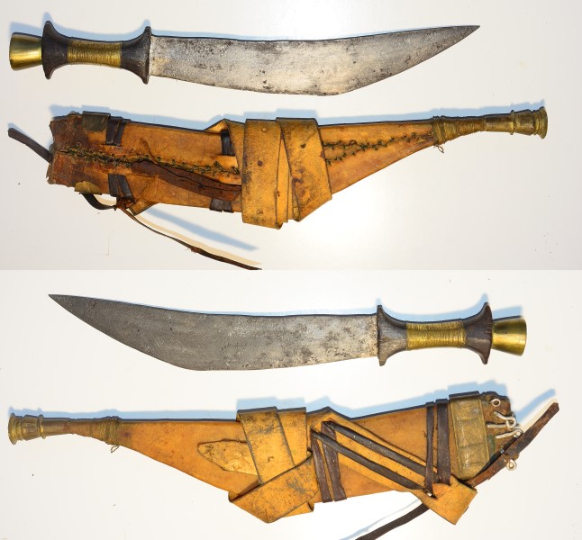 Dolch als Somalien, 27,1 cm lange Klinge, Holzgriff mit Messingknauf, Griff mit Messingdraht umwickelt, mit fester Lederscheide und zugehörigem Gürtel, die Klinge wurde vom Vorbesitzer mit Silberbronze gestrichen, was man aber mit Benzin oder Verdünnung abwaschen kann