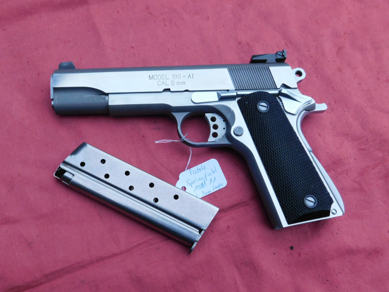 Springfield 1911 A1 in Stainless Kal. 9 mm Luger mit LPA Visier verstellbar, Abzug mit Triggerstop, Beavertail, Compathammer, top Zustand. Lauf innen spiegelblank und Profil scharf. Gültiger Beschuss vorhanden. Meiner Meinung nach leichte Gebrauchsspuren.