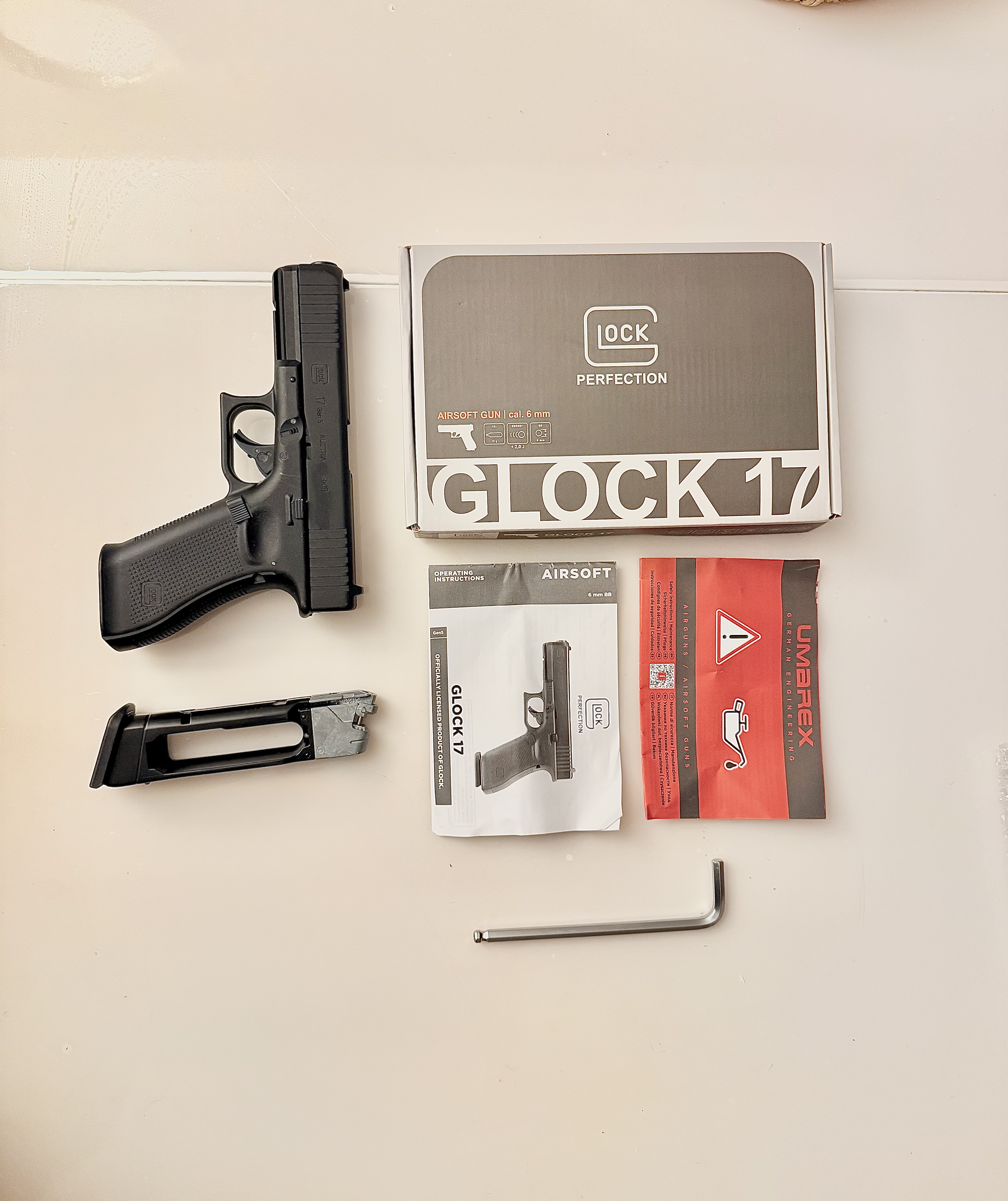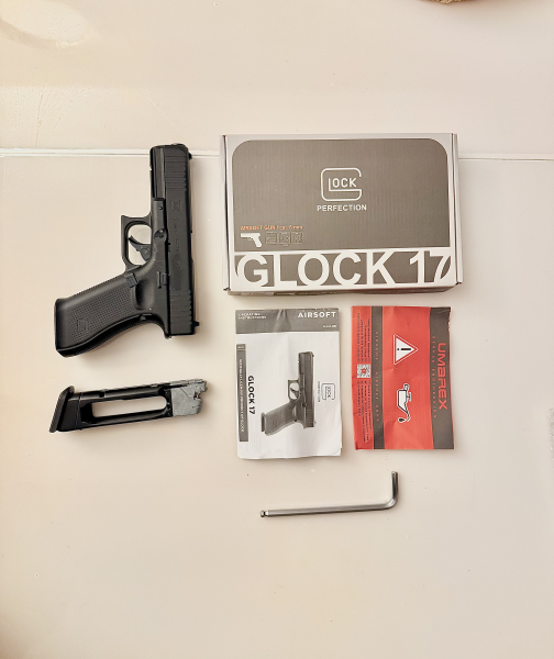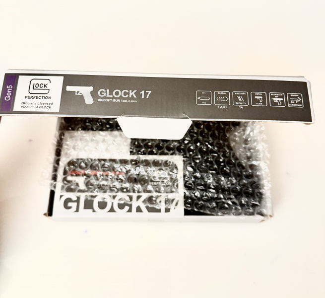 Zum Verkauf steht eine original lizenzierte Glock 17 Gen. 5 MOS Airsoftreplika mit realistischem CO₂-Blowback-System und Metallschlitten.