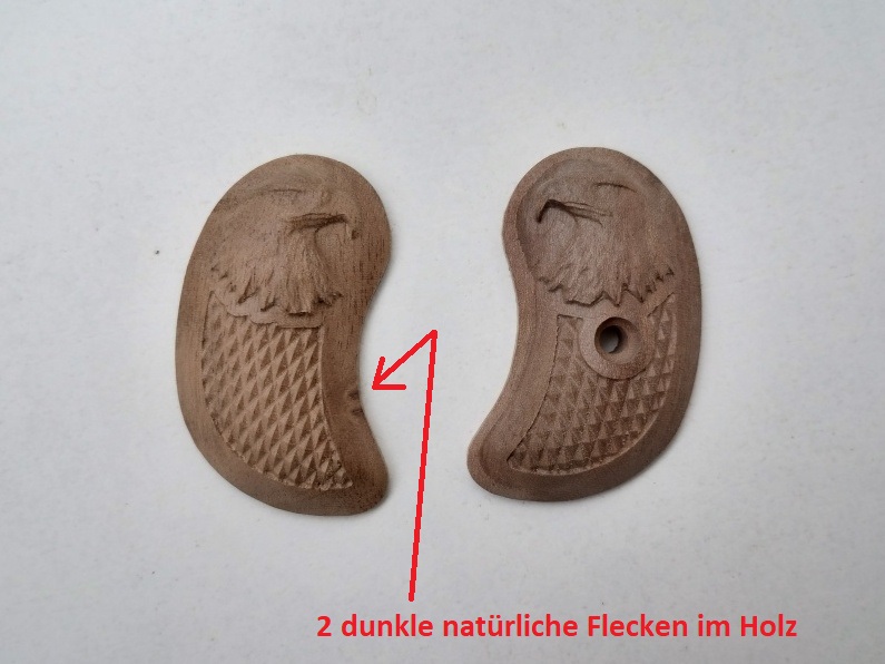 Die Griffschalen haben Adlerkopf-Gravur und sind unversiegelt auf der Oberfläche, damit der Verbraucher die Griffschalen nach seinem eigenen Wunsch färben (beizen), ölen oder wachsen kann.