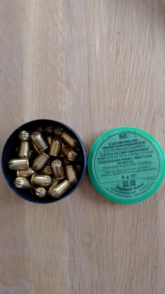 biete 35 St. Viehbetäubungskartuschen grün für Schweine und Kälber. Cal. 9X17. Trocken gelagert. Privatverkauf, keine Gewährleistung, keine Rücknahme.