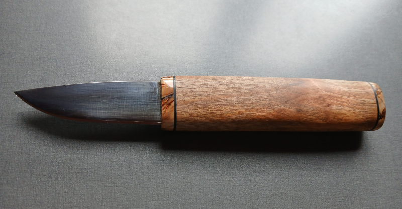 Es ist ein sehr handliches Messer mit einer 3 mm starken Sandvick-Stahl Klinge 12C27 rasierscharf geschliffen. der Griff wurde aus Mammutbackenzahn und