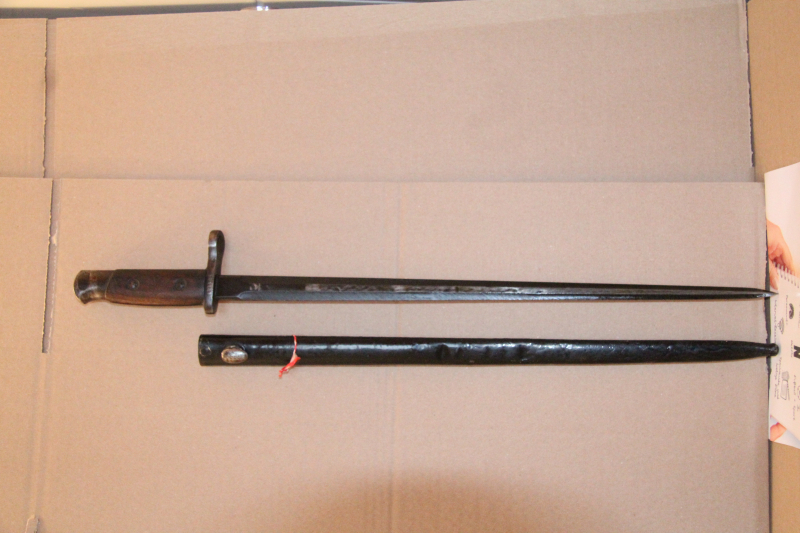 Bajonett mit Kreuzklinge und C im Oval gestempelt.Parierstange mit einem L im Quadrat gestempelt.Klinge spitz ohne Kerben mit Brünierung.Laufring 15mm,Griffschalen ohne Kerben,Drücker gut.Scheide mit kleineren Dellen.Soll in den Kolonien getragen worden sein.Nummerngleich