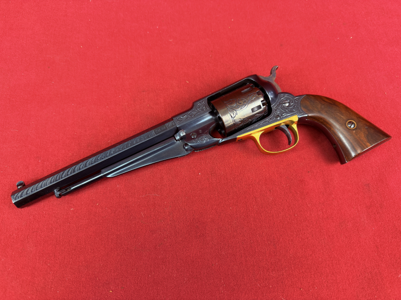 Es handelt sich hier um einen Remington Clone, New Model Army, sie wurde vom Werk Graviert die Waffe ist ungeschossen und befindet sich in neuwertigen Zustand, dass Kaliber ist .44 diese Waffen sind sehr Gut zu sportlichen Scheißen geeignet, da der Rahmen oben durch die Brücke geschlossen ist und die Waffen da durch sehr Präzise Schießen, der Hersteller ist Santa Barbara.