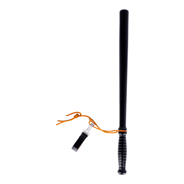 Schlagstock aus Holz, ca. 55cm lang, schwarz lackiert, mit Lederschlaufe und Koppelhaken